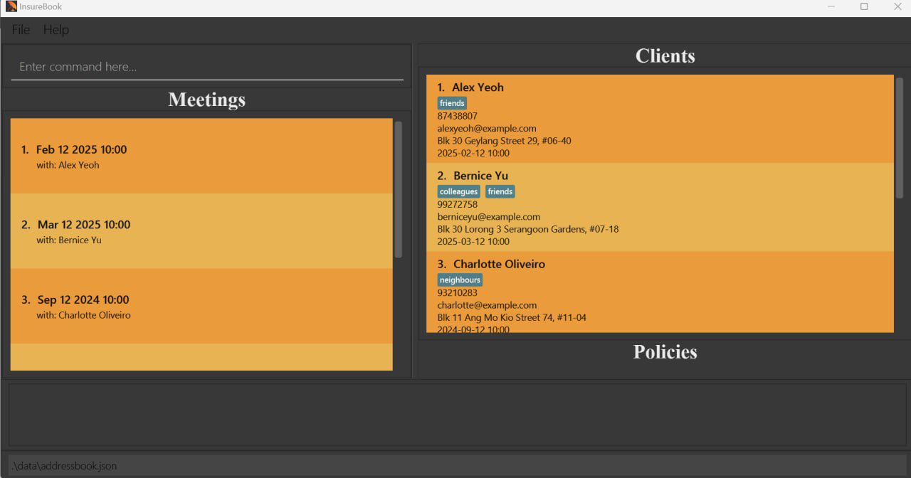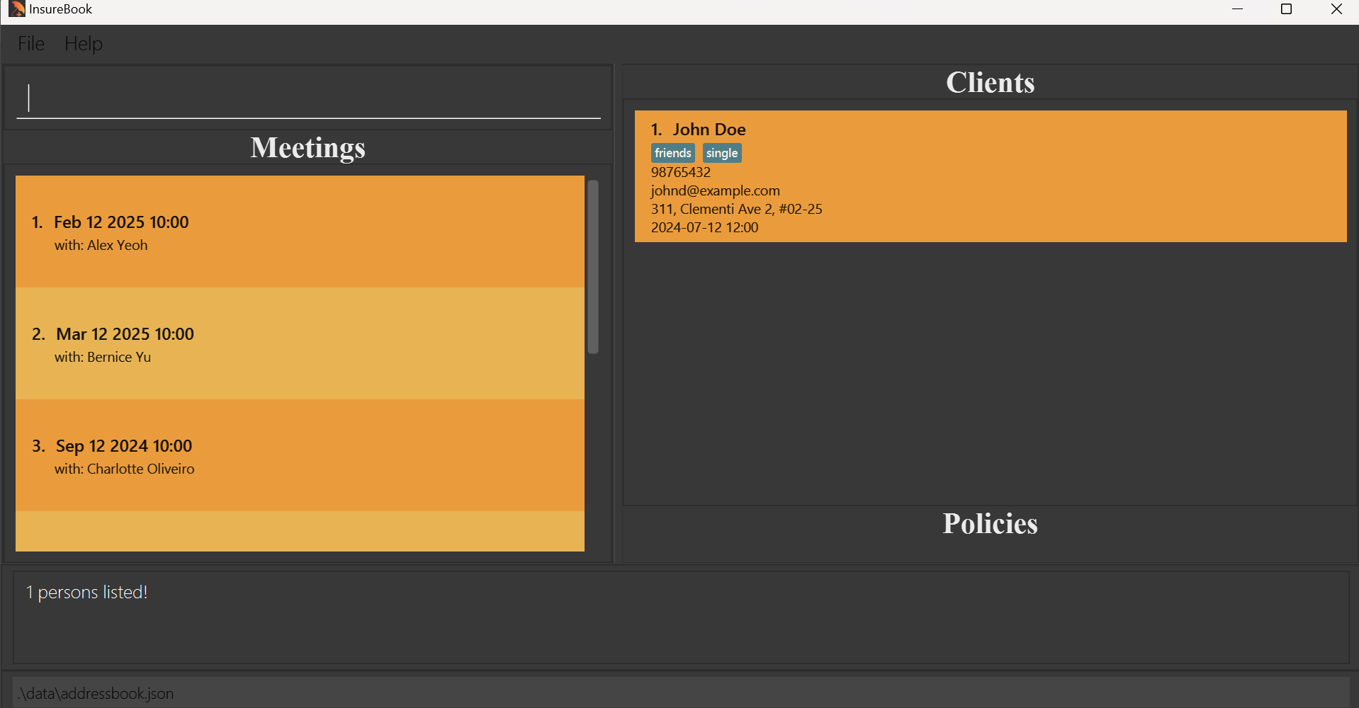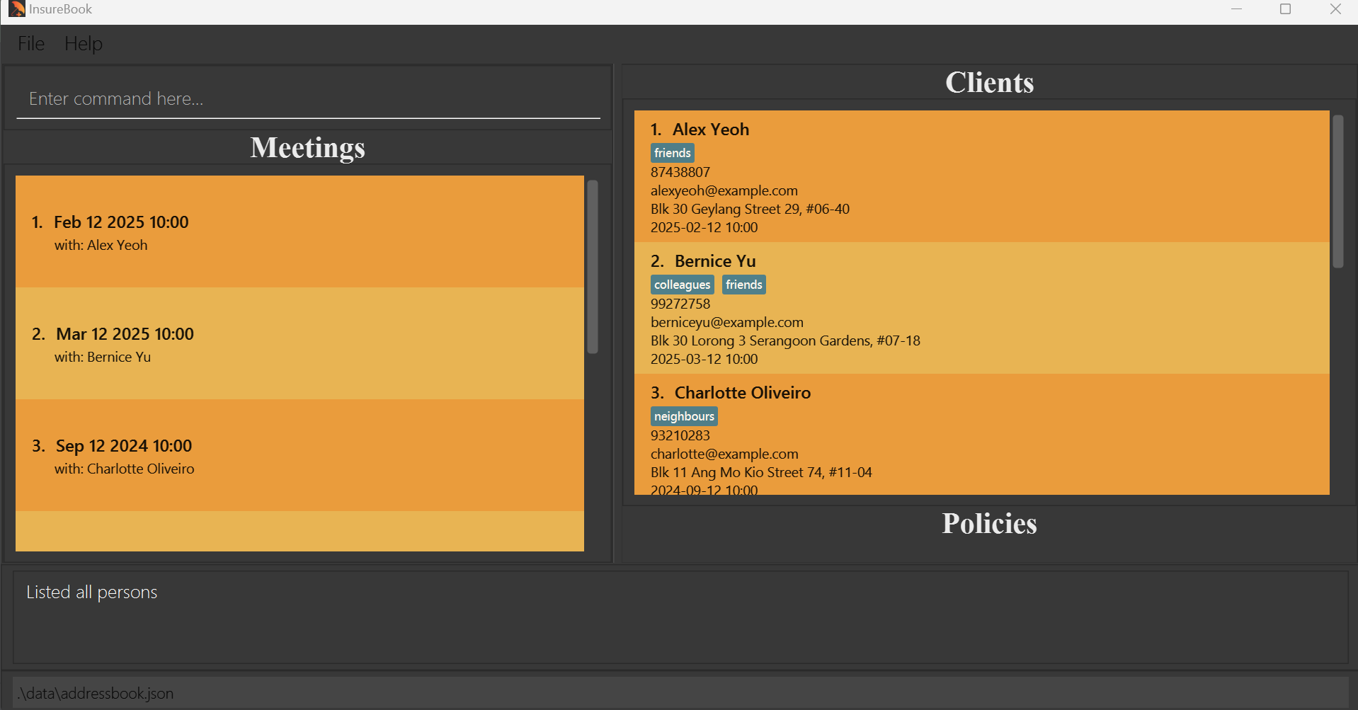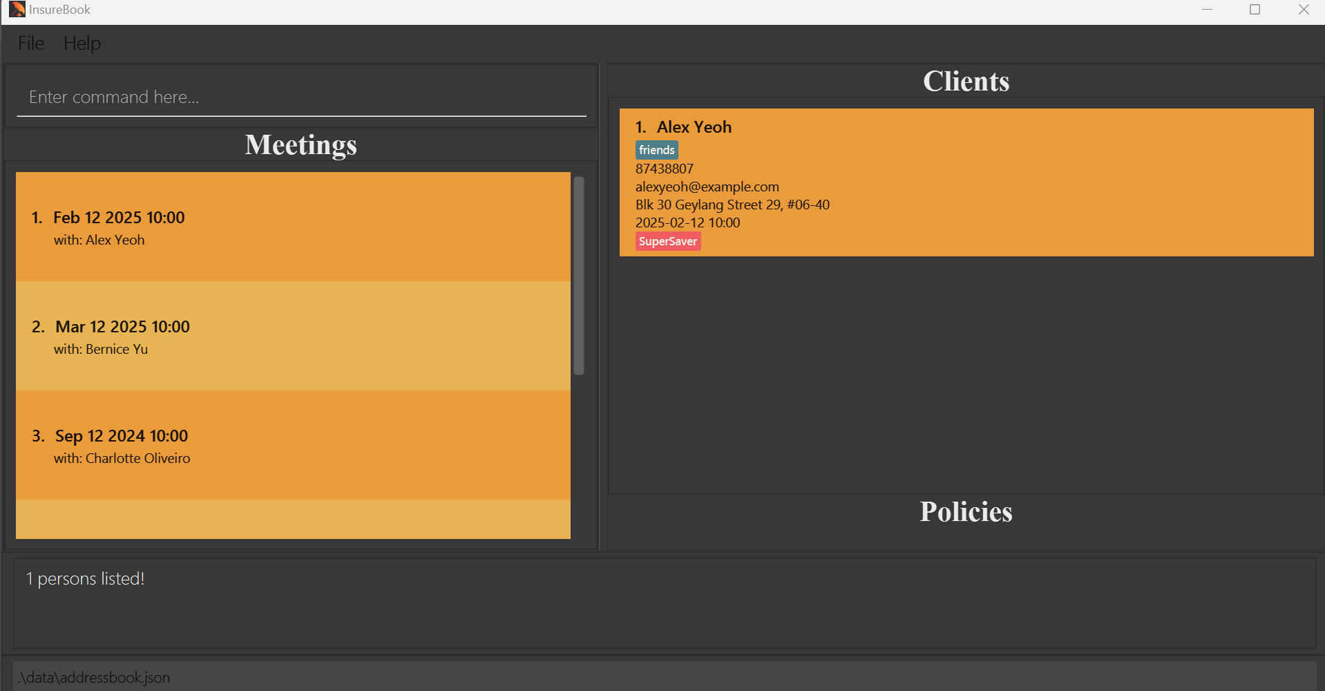 InsureBook is a desktop app for insurance agents to manage potential and existing clients' personal and policy details. The app has a Graphical User Interface (GUI), but most user interactions occur via a Command Line Interface (CLI). If you can type fast, InsureBook can get your client management tasks done faster than traditional GUI apps!
