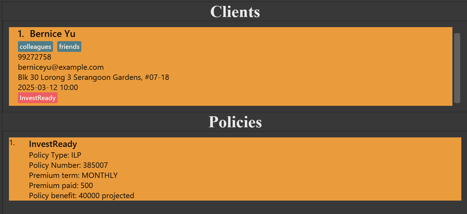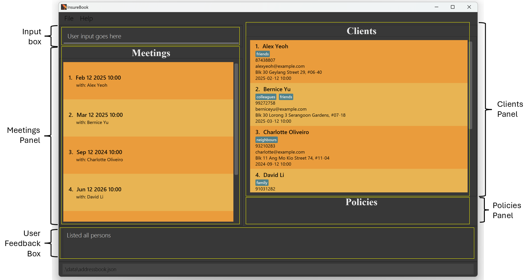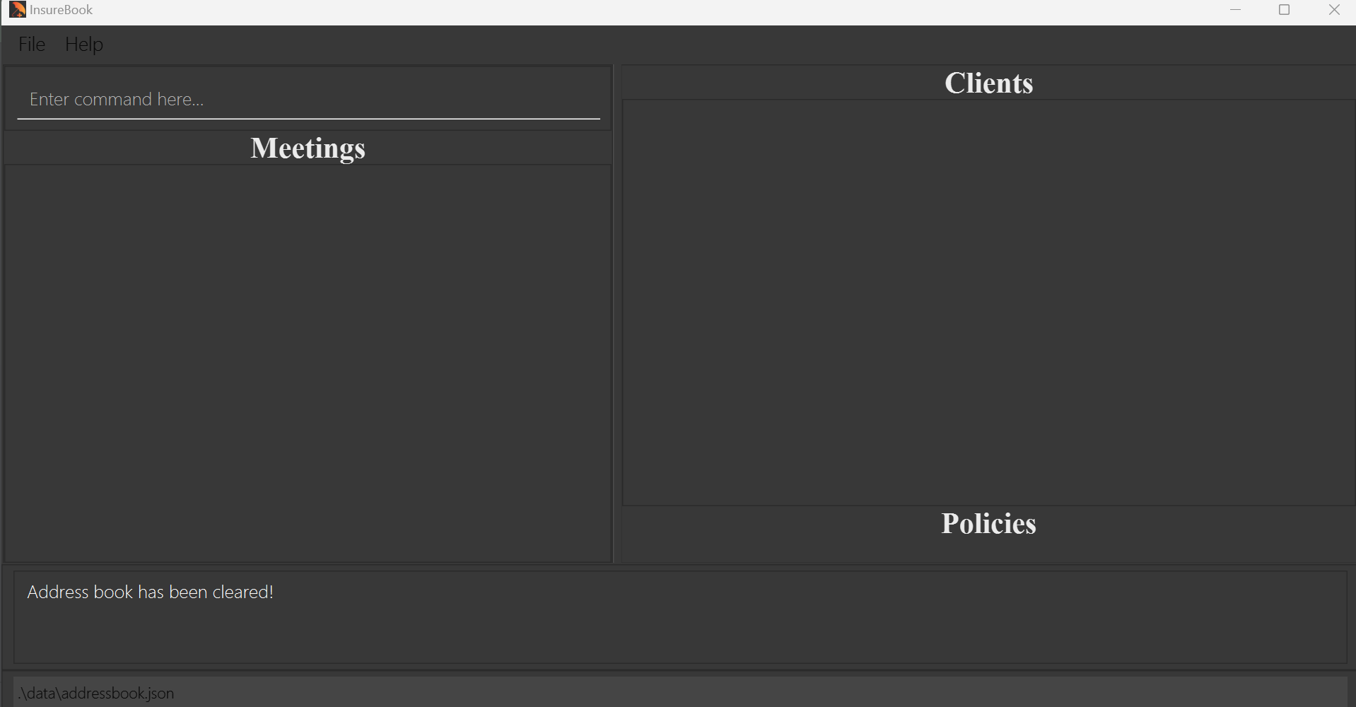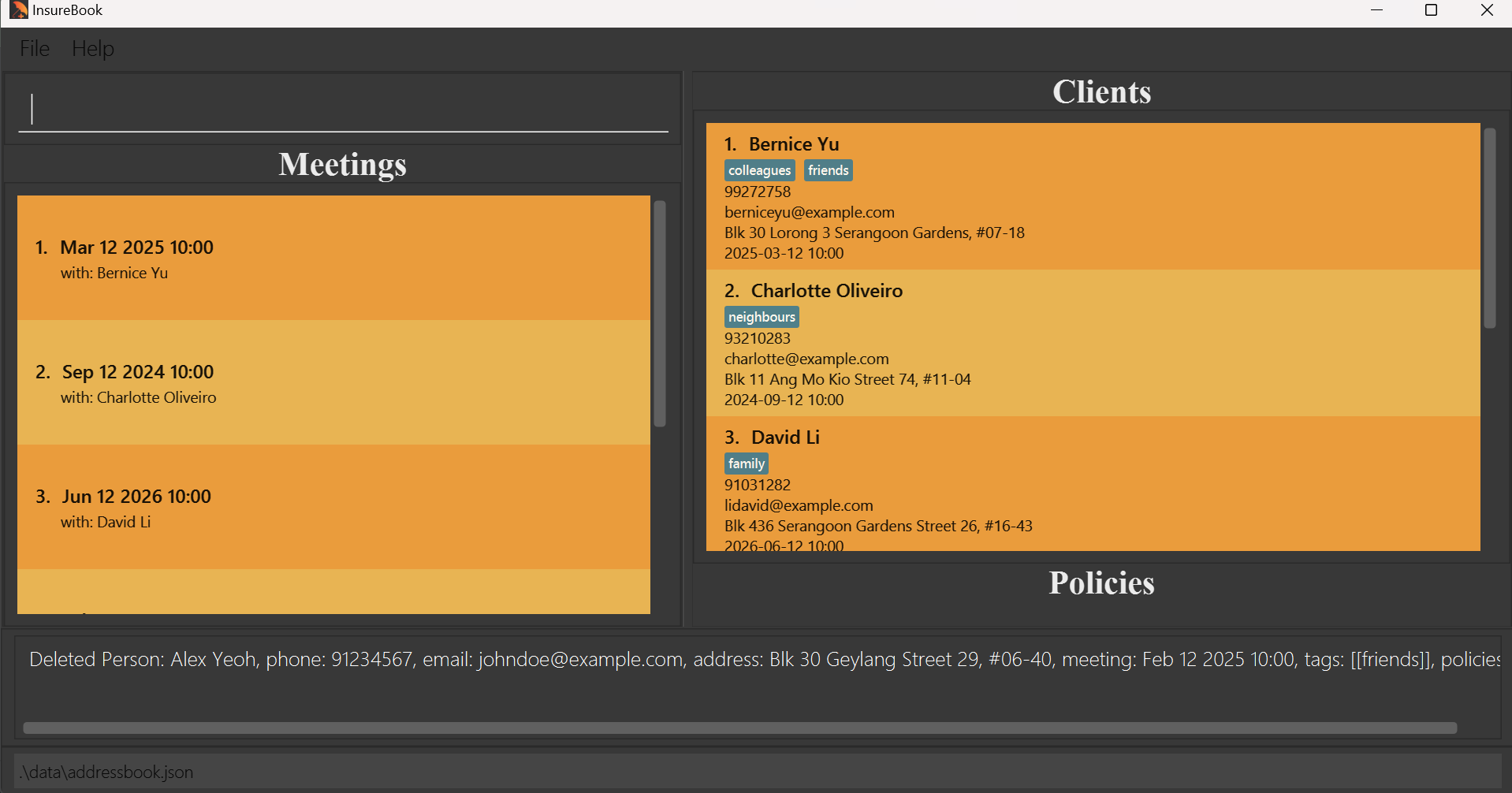 InsureBook is a desktop app for insurance agents to manage potential and existing clients' personal and policy details. The app has a Graphical User Interface (GUI), but most user interactions occur via a Command Line Interface (CLI). If you can type fast, InsureBook can get your client management tasks done faster than traditional GUI apps!